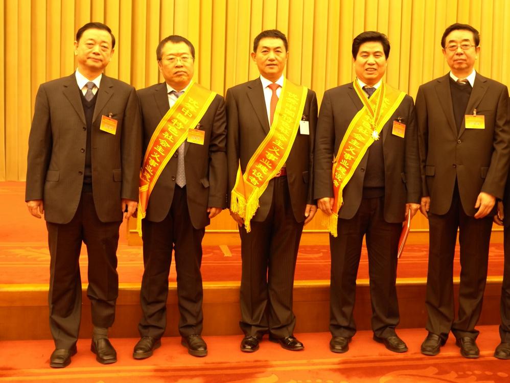 山西省工商聯(lián)主席李武章,中共山西省委統(tǒng)戰(zhàn)部副部長、省工商聯(lián)黨組書記、副主席楊臨生和山西省三位獲獎?wù)咂髽I(yè)家:大運集團董事長遠(yuǎn)勤山、長治市南燁實業(yè)集團董事長李建明、大同市華岳建設(shè)集團董事長昝寶石合影(照片從右到左)