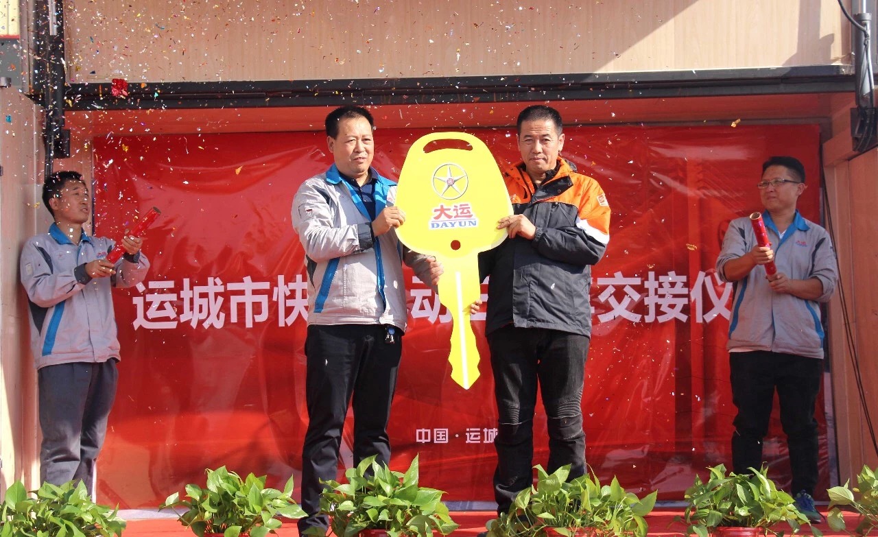 最后,在歡慶的歌聲和隆重的禮炮聲中,周總將代表著本次快遞車(chē)輛交接儀式的金色鑰匙模型鄭重的交付至楊元德會(huì)長(zhǎng)的手中,至此,運(yùn)城市快遞行業(yè)協(xié)會(huì)-大運(yùn)快遞車(chē)交接儀式圓滿(mǎn)落下帷幕。