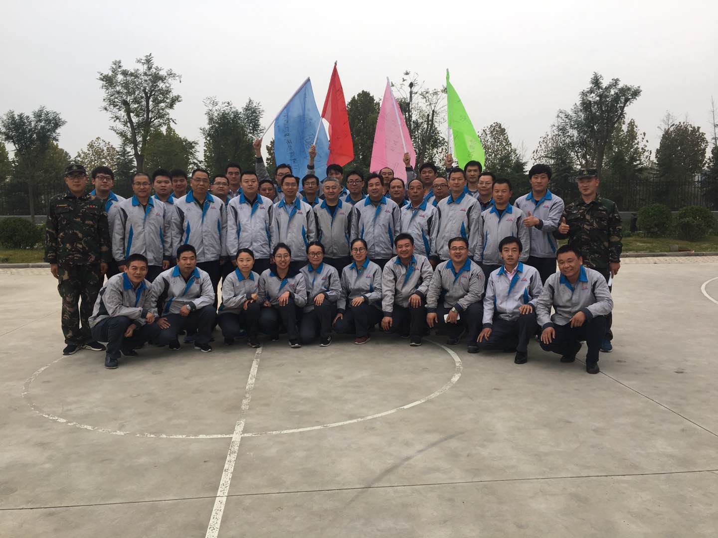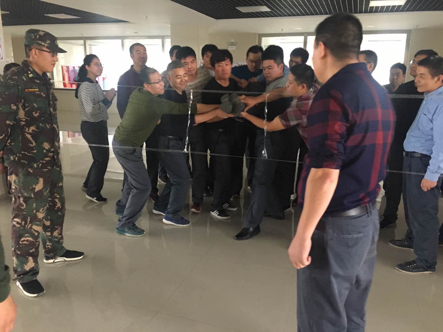 在開(kāi)營(yíng)活動(dòng)中,培訓(xùn)教官通過(guò)生動(dòng)有趣的熱身游戲使干部們做到“三個(gè)忘記”:忘記年齡、忘記工作身份、忘記性別,使大家拋開(kāi)一切,全身心的投入到訓(xùn)練中。團(tuán)隊(duì)組建環(huán)節(jié)中,大家組成四支斗志昂揚(yáng)的隊(duì)伍,充分發(fā)揮團(tuán)隊(duì)合作精神,集思廣益,“起隊(duì)名”、“唱隊(duì)歌”、通過(guò)不同的造型展示自己團(tuán)隊(duì)最好的精神風(fēng)貌。在“支援前線”和“搶灘登陸”環(huán)節(jié)中,四支隊(duì)伍你追我趕,互不相讓,每個(gè)人都發(fā)揚(yáng)不怕吃苦、無(wú)私奉獻(xiàn)的精神,為了團(tuán)隊(duì)的榮譽(yù),有的干部甚至脫掉了外套、鞋子、襪子,光腳站在水泥地上,為團(tuán)隊(duì)榮譽(yù)而戰(zhàn),力爭(zhēng)第一;最后的“穿越電網(wǎng)”環(huán)節(jié),活動(dòng)雖然失敗三次,但是仍然不放棄,在隊(duì)長(zhǎng)和指導(dǎo)員的帶領(lǐng)下,總結(jié)經(jīng)驗(yàn),發(fā)揮團(tuán)隊(duì)凝聚力和執(zhí)行力,終于在第四次的行動(dòng)中,成功完成挑戰(zhàn),歡呼聲響徹訓(xùn)練場(chǎng),每個(gè)人的臉上都洋溢著成功的喜悅。