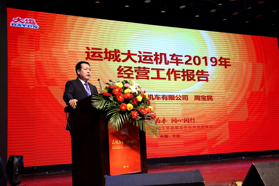 運(yùn)城大運(yùn)機(jī)車(chē)總經(jīng)理周寶民向參會(huì)嘉賓做了運(yùn)城大運(yùn)機(jī)車(chē)2019年經(jīng)營(yíng)工作的報(bào)告,周總分別從“一增長(zhǎng),兩提高,三解決”三個(gè)方面準(zhǔn)確、精煉的總結(jié)了2018年公司經(jīng)營(yíng)工作所取得的成績(jī)。同時(shí)提出2019年“堅(jiān)持不懈做精品,堅(jiān)定不移抓質(zhì)量,共享共贏談合作,堅(jiān)定信心求發(fā)展”的經(jīng)營(yíng)思路。另外,他還分別從加大投入、做精產(chǎn)品、質(zhì)量管控、深耕市場(chǎng)、戰(zhàn)略合作及內(nèi)部管理等六個(gè)方面對(duì)2019年的工作進(jìn)行了詳細(xì)的部署。他在講話中強(qiáng)調(diào),全面進(jìn)擊不能一蹴而就,必須有著十足信心和永攀高峰的理念及過(guò)程,如此才能穩(wěn)扎穩(wěn)打、穩(wěn)攻穩(wěn)進(jìn)。同行源于同心,共創(chuàng)方能共贏。